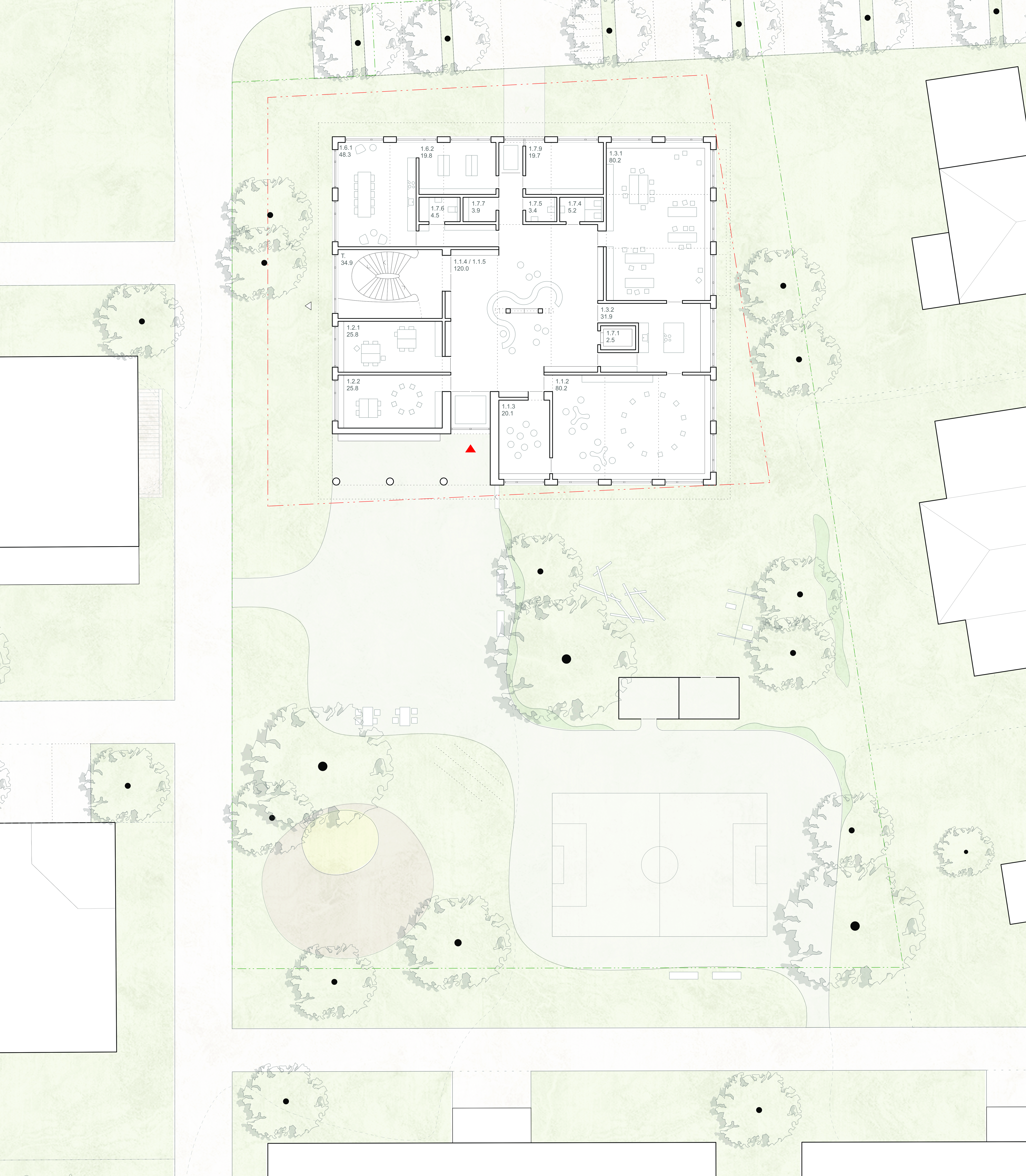 Die Positionierung der Schule im Norden des Grundstücks spielt einen grosszügigen Aussenraum im Süden frei, der an die umliegenden Freiräume anknüpft und wesentlich zur Identität der Quartiersentwicklung beiträgt. Der Aussenraum verfügt über vier grosse Bereiche, welche ganz spezifische Qualitäten und Atmosphären aufweisen und für unterschiedliche Aktivitäten Raum bieten, wie Begegnung und Erholung, Spiel und Aufenthalt. Der Aussenraum der Kindergärtner ist leicht abgesenkt und durch eine raumbildende Vegetation abgetrennt.
